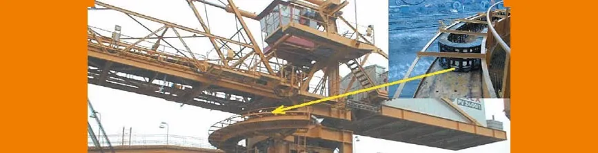 Un porte-câble à chaîne d'énergie est utilisé dans cette excavatrice à roue-pelle utilisée dans l'exploitation minière à ciel ouvert. La chaîne d'énergie fait partie de l'ensemble rotatif.