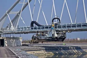 Cette usine de traitement des boues a été planifiée, construite et mise en service en seulement 30 mois. Ses éléments clés sont un pont en arc ainsi que deux pompes mobiles à haut rendement qui transfèrent les boues au moyen de tuyaux extrêmement stables et épais. La plus grande chaîne d'énergie en plastique au monde est utilisée pour guider de manière fiable les lourds tuyaux. Malgré les énormes poids de remplissage, cette chaîne garantit la longue durée de vie prévue de l'ensemble de l'installation. Dès le premier jour, l'entreprise chargée de la construction de l'usine et le fournisseur du système ont collaboré avec succès à la conception de ce projet de grande envergure. Cette collaboration précoce porte aujourd'hui ses fruits.
