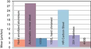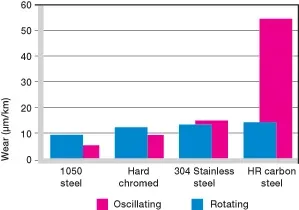 Par rapport à l'iglide® A200, les propriétés tribologiques améliorées de l'iglide® A290 se reflètent également dans les coefficients d'usure. A faible charge, les différences de résistance à l'usure des combinaisons d'iglide® A290 avec différents matériaux d'arbres sont très nettes. La figure 9.8 montre que l'avantage des arbres chromés durs augmente avec la charge. Ce contre-partenaire est également bien adapté aux applications pivotantes, que l'on trouve fréquemment dans les machines d'emballage. D'autres surfaces trempées sont également recommandées pour les mouvements oscillants, par exemple l'acier trempé et rectifié 1050.