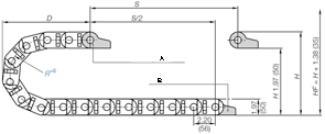 In this version special plastic glide shoes are mounted on the side of the chain link every 1.000 to 2.000 mm. The function of these guide elements resembles the leeboards used on sail boats. Some of these leeboards are conceived in such a way that in contact with firm ground they pivot upward and enable the continuation of the travel. Similarly the glide shoes in AUTOGLIDE go up and down, each according to its position as lower run or upper run of the chain. They provide the precise lateral guidance and a smooth glide of the e-chain®.