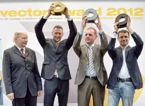 Winners of third vector-awards (from left): Gold winner Michael Büchel (KUKA Systems GmbH, Germany), Joury van Gijseghem (DEME, Belgium) and Fabio Ferri (SCM Group, Italy) with Günter Blase (igus®).