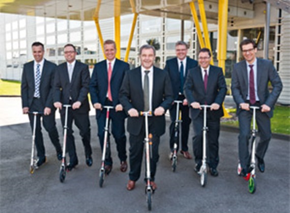 De gauche à droite : Tobias Vogel, Directeur commercial paliers lisses polymères ; Michael Blaß, Directeur commercial chaînes porte-câbles ; Frank Blase, P.D.G. ; Gerhard Baus, Vice-président, Directeur commercial et technique paliers lisses polymères ; Artur Peplinski, Vice-président, Directeur commercial export ; Harald Nehring, Vice-président, Directeur technique chaînes porte-câbles ; Christoph Müller, Vice-président, Directeur financier