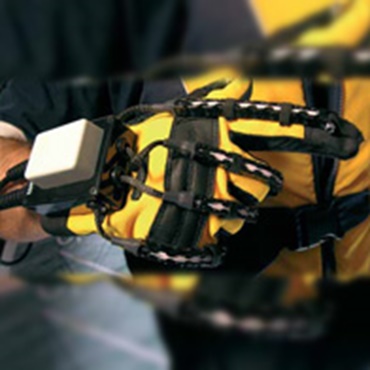 série igus® E03 sur un gant de données afin de protéger les capteurs de manière à ce que les gants puissent être enfilés et enlevés plus facilement. Hauteur intérieure de 5 mm seulement.