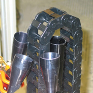 Nombreux câbles très près les uns des autres dans une chaîne porte-câbles. Guidés avec ménagement grâce aux contours lisses.