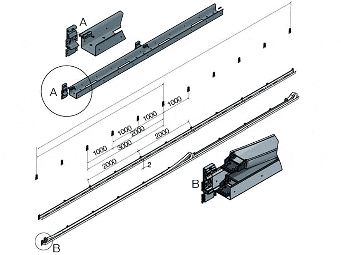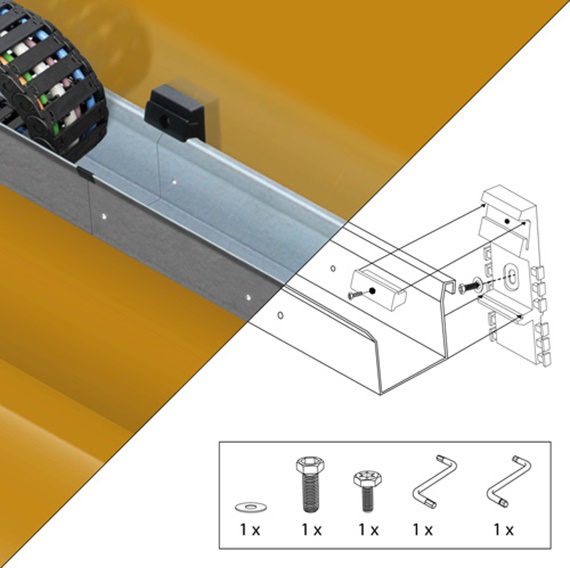 La goulotte de guidage guidefast est fixée latéralement à la poutre du pont. Les consoles soudées deviennent donc superflues. Le temps de montage est très faible, la goulotte de guidage étant tout simplement accrochée dans le support préalablement fixé et maintenue en place grâce à des blocages. Le nombre réduit de composants différents et la largeur de goulotte fixe contribuent également à faciliter le montage.