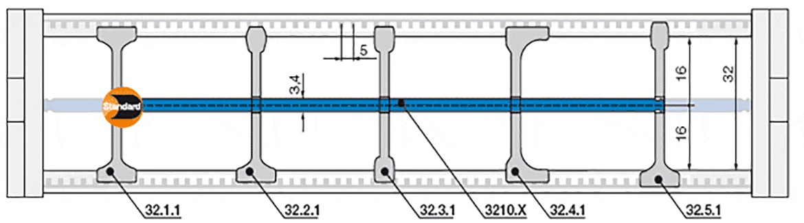 64 hauteurs internes : 32 mm, 42 mm, 56 mm et 80 mm