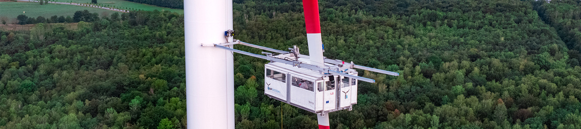 Le système fait appel à trois filins d'ancrage de la cabine, commandés par des treuils, et à un appui au mât. La plate-forme est ainsi mobile verticalement. Horizontalement, elle peut se déplacer sur une distance de 15 mètres maximum. La cabine est même en mesure de suivre la rotation de la pale de son ancrage au rotor jusqu'à la pointe. La plate-forme peut aussi être agrandie en position de travail en faisant sortir des «balcons ».