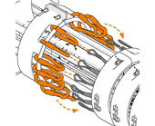 e-loop associe les avantages d'une chaîne porte-câbles en polymères à ceux d'un câble très résistant à la traction. Les forces de traction sont absorbées par le câble de traction à l'intérieur de la chaîne et conduites dans les éléments de fixation et la structure. Ainsi, les câbles ne subissent aucune sollicitation en traction.