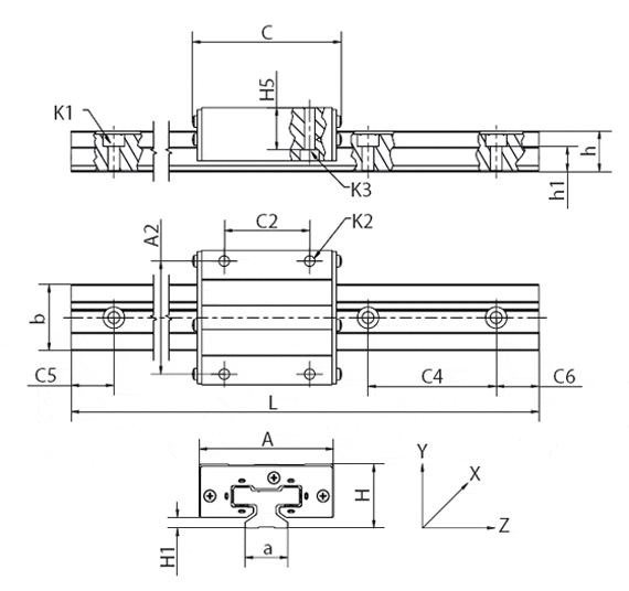 | Référence | Poids | H ±0,35 | H5 | A | C | A2 | C2 | H1 ±0,35 | K2 | K3 | ||