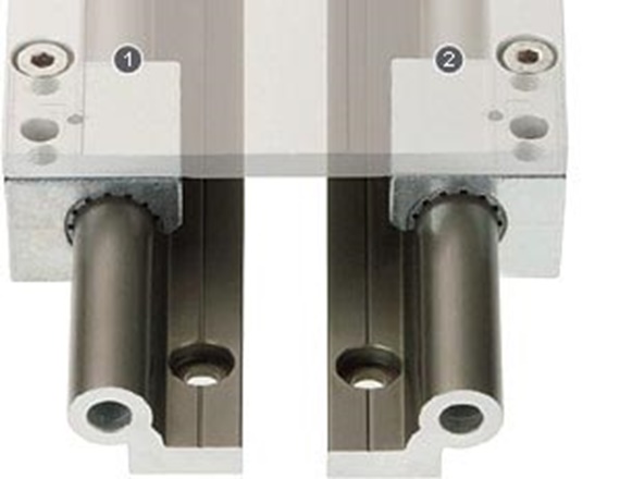 Lors de la mise en œuvre de systèmes à deux rails parallèles, l'un des côtés doit être conçu comme patin flottant. Il existe une solution patin fixe / patin flottant adaptée à chaque position de montage. Ce type de construction permet d'éviter des mouvements saccadés voire des blocages du guidage en cas d'erreurs de parallélisme entre les rails. Le patin flottant est réalisé grâce à une augmentation contrôlée du jeu dans la direction où le défaut de parallélisme risque de se produire. Un degré de liberté supplémentaire est ainsi créé d´un côté.