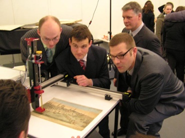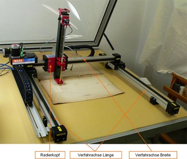The restorer's query aroused the curiosity of three students of the mechanical engineering faculty in the Hans-Böckler-Schule at the Berufskolleg in the city of Münster. Jan Hallek, Guido Madsack and Jürgen Reinker decided to make this project the topic of their degree thesis. Thus they developed the first eraser robot in the world to process pictures fully automatically.