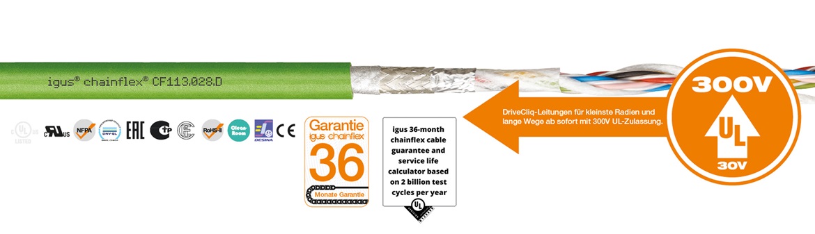 Conséquence logique de cette exigence technologique, igus vient de faire valider par un organisme extérieur la promesse de qualité liée à la marque pour ses câbles chainflex. Au terme d'un processus de certification complexe, l'institut américain « Underwriters Laboratories » a confirmé l'exactitude de l'affirmation « igus 36-month chainflex cable guarantee and service life calculator based on 2 billion test cycles per year ». igus est ainsi la première entreprise d'Europe qui a fait confirmer par une institution de contrôle de réputation internationale la validité de ce que promet la marque.