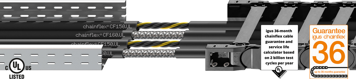 L'arrivée des nouvelles séries de câbles CF150.UL et CF160.UL permet maintenant de poser les câbles directement sur un chemin de câbles à la sortie de la chaîne porte-câbles, les câbles étant « UL listed ». Les plots en aval de la chaîne porte-câbles et le stockage de câbles de différents types pour les chaînes porte-câbles et le câblage fixe peuvent ainsi être supprimés. Les deux types de câble sont des câbles de commandes et ils viennent étoffer la gamme de câbles en PVC. Ils se démarquent nettement d'autres câbles MTW dans la mesure où nous avons aussi totalement misé sur une durée de vie garantie et sur des tests dans notre laboratoire de tests chainflex pour cette élargissement de gamme.
