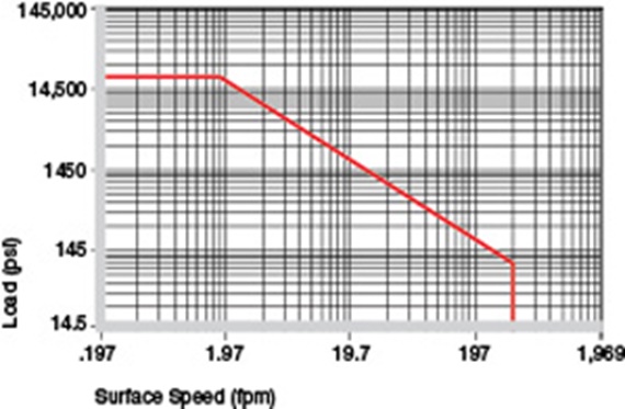 Figure 01: Permissible p x v values for iglide® X6 bearings with a 1 mm wall thickness, in dry operation against a steel shaft at 68°F, installed in a steel housing.