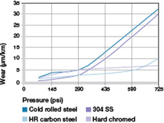 Figure 08: Wear with different shaft materials in rotational operation, as a function of the pressure