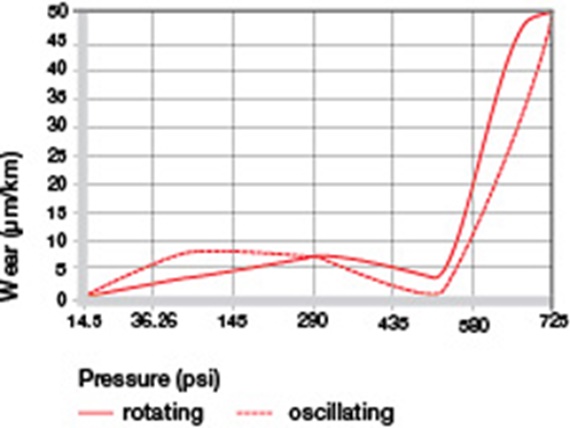 Figure 09: Wear for oscillating and rotating applications with shaft materials cf53 hardened and ground steel, as a function of the pressure
