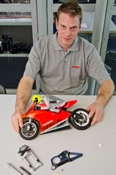 Clark Wohlert, champion d'Europe de course de modèles réduits, a rendu visite à igus® et a présenté sa moto RC, la jabber de Lightscale. Suscitant l'enthousiasme de Thomas Preissner, car iglidur® est présent à double titre dans la jabber. Un palier en iglidur® G est monté dans la surface de roulement anodisée dure de la fourche. Et le bras oscillant de la roue arrière est équipé, quant à lui, d'un palier à collerette en iglidur® J. Selon Clark Wohlert, les paliers iglidur® sont les garants de mouvements sans jeu et avec peu de frottement. Des caractéristiques très importantes pour la course de modèles réduits, la jabber ayant une vitesse de pointe de 110 km/h. Une vitesse qui en fait la moto de course en modèle réduit la plus rapide à l'heure actuelle.