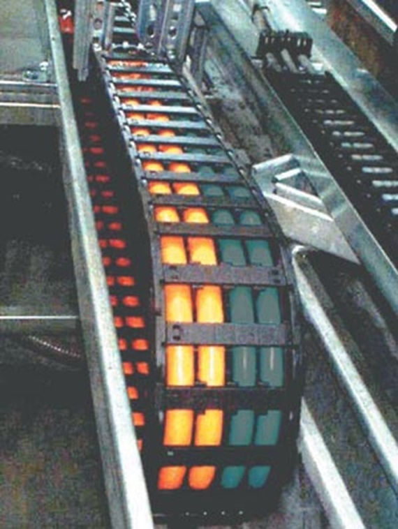 Les deux câbles disposent des mêmes sections nominales et de matériaux d‘isolation. Le câble A est pourvu d‘une gaine intérieure et le câble B d‘un bandage textile et matériaux de remplissage. L‘ échantillon comparable (modèle B) présente, déjà au bout de 145 000 doubles courses, la formation d‘un "tire-bouchon". Le "tire-bouchon" qui se forme sur un câble est tout simplement le résultat d‘une déformation en forme d‘hélice telle qu‘elle est représentée sur l‘illustration, modèle B. Alors que chez le câble A, c‘est la gaine intérieure qui remplit les interstices en créant une structure de câble rond, le câble B a besoin de matériaux de remplissage dans ces espaces. Les matériaux de remplissage sont, tout comme l‘âme, en polyéthylène fibreux. Ils se laissent aisément comprimer et ne peuvent par conséquent pratiquement pas avoir d‘effet de maintien. Alors que la gaine intérieure en TPE et que l‘âme en cordage du câble A maintiennent les conducteurs dans une position définie, les conducteurs du câble B peuvent se mouvoir de manière incontrôlée. Lors de l‘opération de flexion, un conducteur du câble B s‘est détaché du bandage et a été déplacé, au niveau du rayon de courbure intérieur, vers l‘âme et, au niveau du rayon de courbure extérieur, vers la gaine. Il en résulte des déformations en forme de tire-bouchon qui se répètent périodiquement en fonction des longueurs de pas.