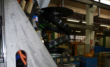 This machine is usually used for woodworking, whereby it could also be used for other materials which are similar to process (e.g. PVC, polypropylene, aluminum etc.). The tool has to be able to carry out numerous different movements in order to follow the workpiece contour, including rotating about its own axis with an overall rotation of 1440 degrees in both directions. For this reason, a solution was required for cable guidance to the tool which would be able to cope with this movement and is also light in terms of weight. The problem was solved in the past through the use of an electro pneumatic distributor that had significant weight, was too expensive and the absence of flexibility in adapting to a change was a further disadvantage. The igus® twisterband was absolutely convincing on all counts. The composition of 6 modules of the chain allows complete coverage of the required stroke. It is light weight and low cost.
