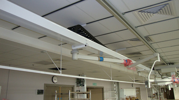 In the emergency room of a hospital radiograms shall be made rapidly without having to move the patients. For this reason the X-ray apparatus was mounded in a rail to the ceiling. This allows flexible use at any place for checkups. Until today such an application wasn’t possible due to hanging cables. Now the cables are guided in an igus roller e-chain® of the series 2828. Because it shows low rolling friction only, the X-ray apparatus can be moved rapidly without effort.