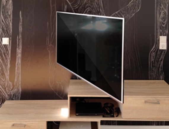 This wall bracket allows the TV set to be swivelled through 120 degrees. Up to now, cables simply hung loosely and became tangled after several swivelling movements, causing the cables to break. This problem has now been solved using an igus® e-chain®: network cable, HDMI cable, internet cable and a fibre optic cable are now guided perfectly. Positive side effect: the cables are invisible even when the TV is set extended.
